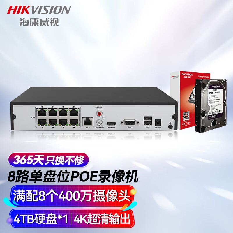 HIKVISION海康威视网络硬盘录像机监控8路POE网线供电NVR支持8个摄像头带4T硬盘DS-7808N-K1/8P价格:1433.00元!