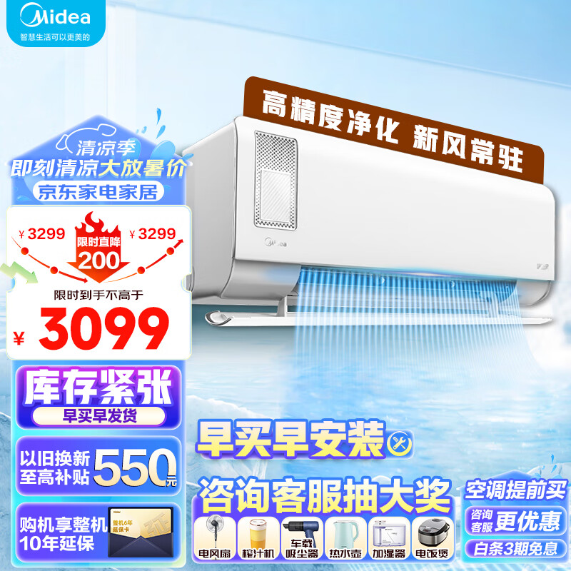 美的(Midea)新风空调挂机1.5匹 新一级能效 变频冷暖卧室家用壁挂 空调挂机 智能家电KFR-35GW/N8XF1-1价格:3099.00元!