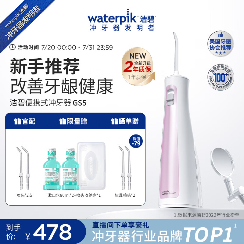 洁碧(Waterpik)冲牙器便携式电动洗牙器水牙线洁牙器 家用立式预防牙结石全身水洗极光系列 GS5粉价格:518.00元!