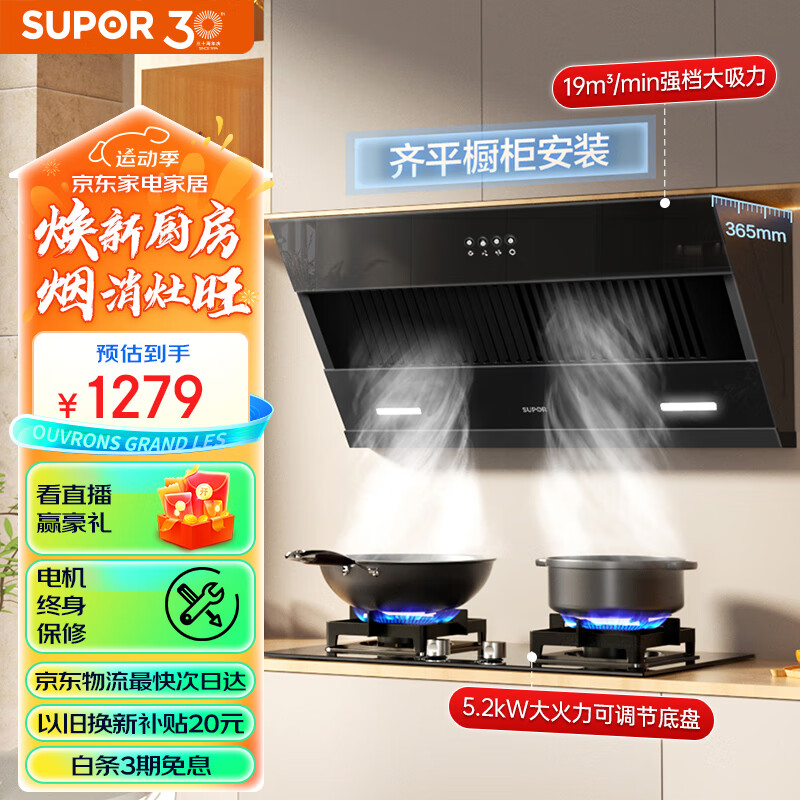 苏泊尔(SUPOR)抽油烟机燃气灶套装 家用小尺寸大吸力 19立方侧吸式小户型烟灶套装DJ13S+DB28液化气价格:1279.00元!