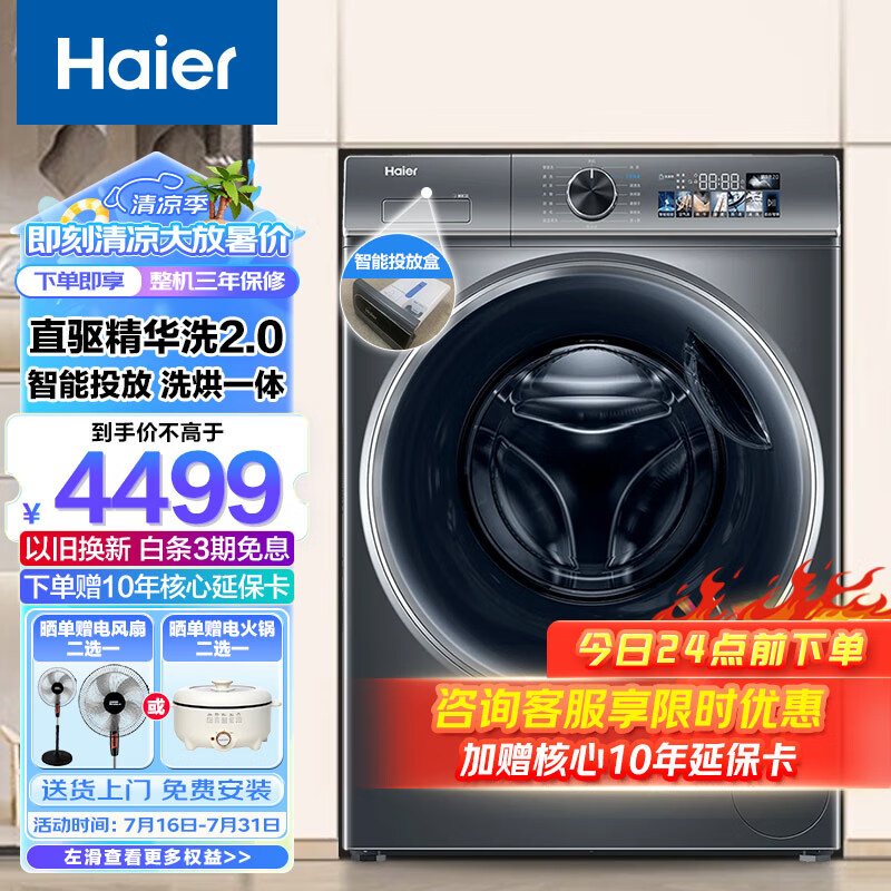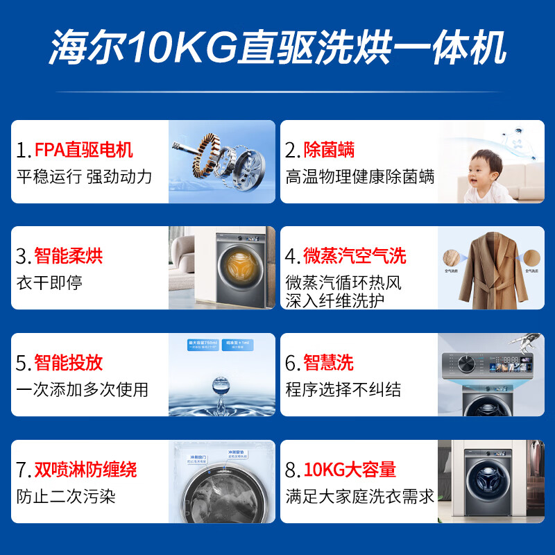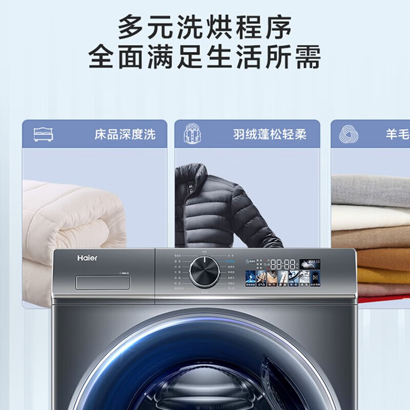 海尔(Haier)【精华洗2.0】10KG直驱变频滚筒洗衣机全自动一级能效智能投放除菌空气洗烘一体机XQG100-HBD1266价格:4499.00元!