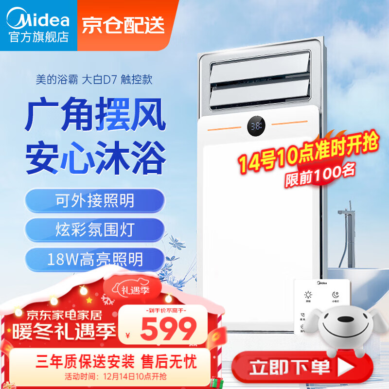 美的(Midea)浴霸暖风照明排气一体集成吊顶卫生间浴室灯取暖机触摸款价格:599.00元!