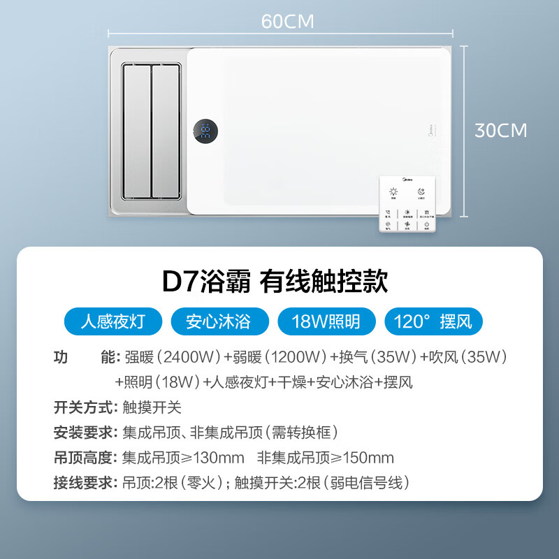4、效果非常好,安装完很好看,换气,除湿,制热试了下都挺好,物流很快,美观大气上档次,很智能还留有夜光功能,总之很满意的购物