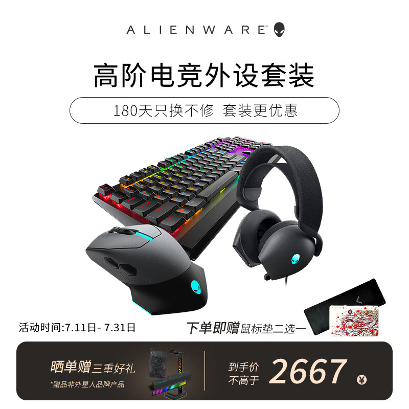 外星人(Alienware)610M+510K+520H 游戏电竞三件套装(无线游戏鼠标 有线机械键盘 电竞耳机)RGB高端外设送礼物黑色价格:2306.60元!