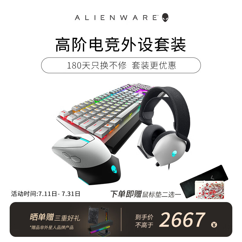 外星人(Alienware)610M+510K+520H 游戏电竞三件套(无线游戏鼠标 有线机械键盘 电竞耳机)RGB高端外设送礼物白色价格:2667.00元!