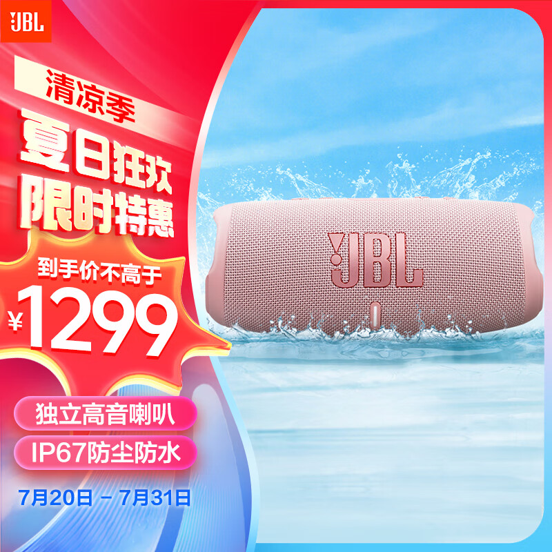 JBL CHARGE5 音乐冲击波五代 便携式蓝牙音箱+低音炮 户外防水防尘 桌面音响 增强版赛道扬声器 粉色价格:1499.00元!