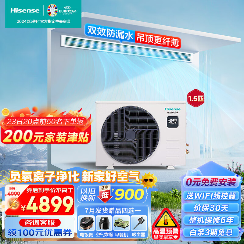 海信中央空调风管机一拖一境界旗舰版一价全包1.5匹嵌入式 3重净化全直流变频1级能效 厂直价格:4999.00元!