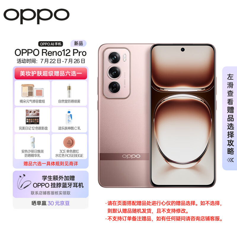 OPPO Reno12 Pro 超美小直屏 安卓Live图 天玑9200+ 16GB+512GB 香槟金 5G手机【美妆护肤礼赠6选1】价格:3999.00元!