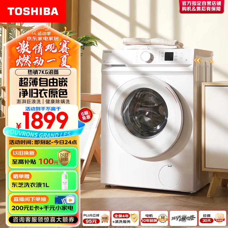 东芝(TOSHIBA)滚筒洗衣机全自动 7公斤超薄洗衣机 BLDC变频电机 小户型家用 健康除螨 以旧换新 DG-7T11B价格:1899.00元!