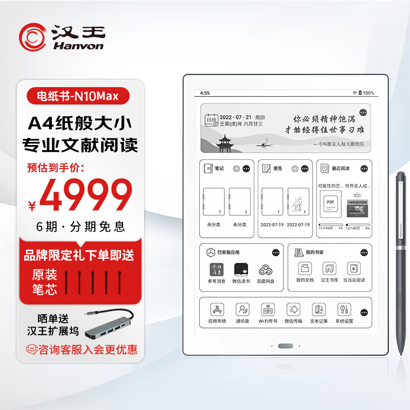 汉王N10Max2024款 电纸书13.3英寸微信读书阅读器专业文献PDF护眼阅览器水墨墨水屏平板办公手写记事本价格:4999.00元!