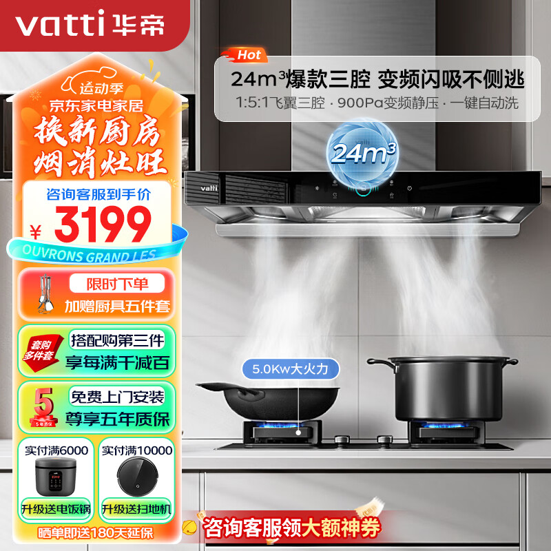 华帝(VATTI)抽油烟机家用顶吸欧式变频大吸力烟机燃气灶烟灶套装24风量自动清洗吸油烟机灶具套装i11206天然气价格:3199.00元!