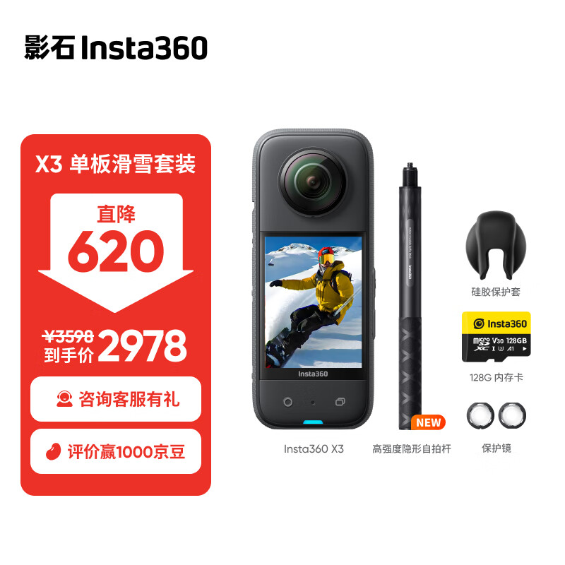 Insta360影石 X3全景运动相机防抖防水摄像机5.7K高清Vlog摩托车骑行滑雪潜水路亚(单板滑雪套装)价格:2978.00元!