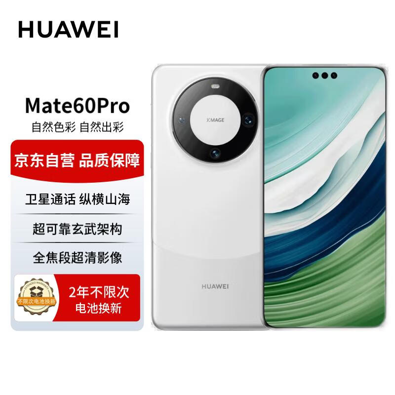 华为(HUAWEI)旗舰手机 Mate 60 Pro 12GB+256GB 白沙银 【两年电池换新套装】价格:7499.00元!