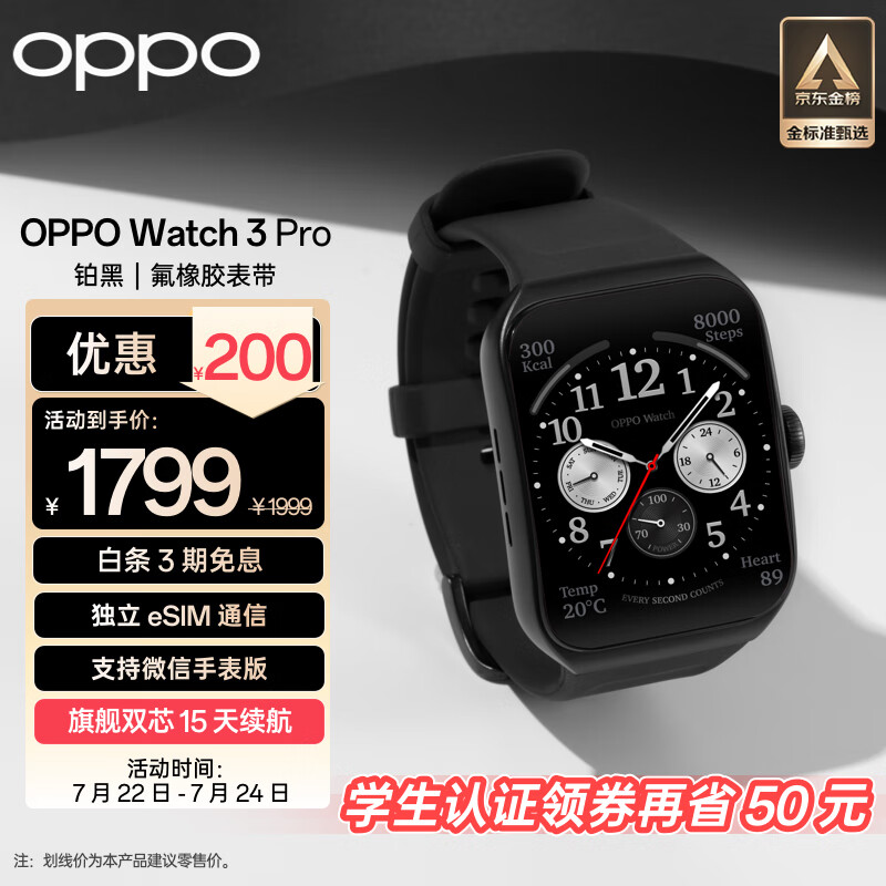 OPPO Watch 3 Pro 铂黑 全智能手表 健康运动手表男女eSIM电话手表 血氧心率监测 适用iOS安卓鸿蒙手机价格:1799.00元!
