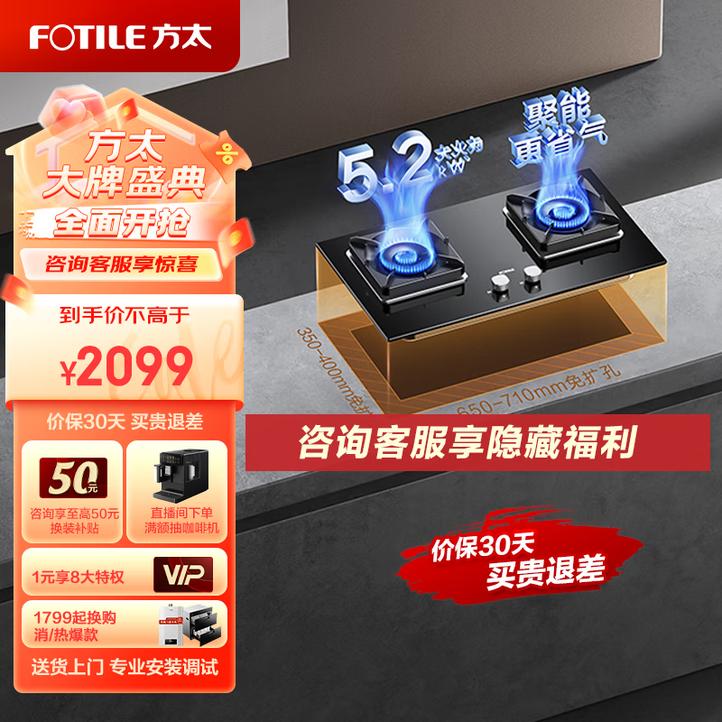 方太燃气灶天然气灶双灶嵌入式 大尺寸大面板燃气灶 一级能效 可调节底盘灶具官方02-TH29B 灶具价格:2099.00元!