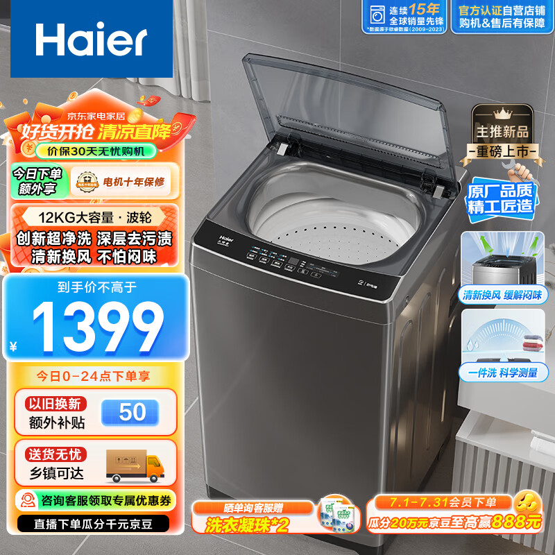 海尔(Haier)波轮洗衣机全自动家用 12公斤大容量 升级除螨 抗菌 全桶换风 强力洗 以旧换新EB120Z33Mate1价格:1399.00元!