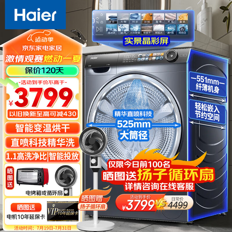 海尔(Haier)洗衣机全自动滚筒洗衣机烘干机一体机实景晶彩屏超薄平嵌大筒径1.1洗净比精华洗直喷科技 智能投放价格:4499.00元!