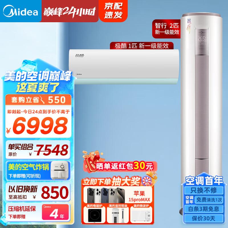 美的(Midea)空调套装 新一级能效 一室一厅 智能家电 双节能低噪 升级自清洁 挂机极酷1匹+柜机智行2匹价格:6998.00元!