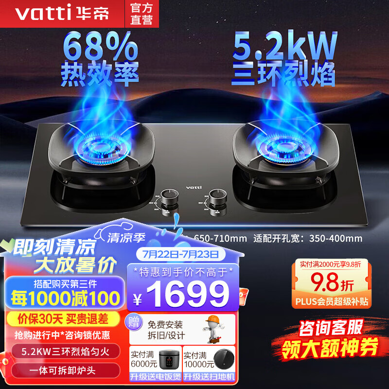 华帝(VATTI)家用燃气灶官方i10309台嵌两用5.2kw三环火力聚能盘68%超高热效率双灶具可拆卸炉头可调节开孔尺寸 【2024新款5.2kW】i10309 天然气5.2kW价格:1999.00元!