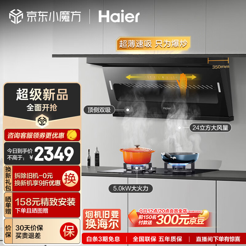 海尔(Haier)抽油烟机顶侧双吸 24m3/min大吸力 挥手智控 7字型家用厨房吸油烟机套装 齐平橱柜C51+Q2BE2天价格:2349.00元!