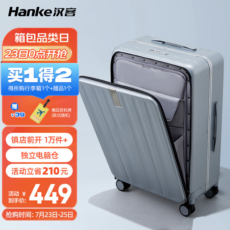 汉客铝框前开盖登机行李箱男20英寸环保灰铝框拉杆箱女密码箱旅行箱价格:659.00元!