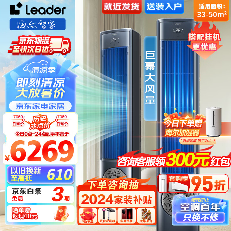 Leader空调海尔智家出品新风空调立式3匹家用冷暖新一级能效变频节能柜机自清洁空调KFR-72LW/01VDA81TU1价格:6269.00元!