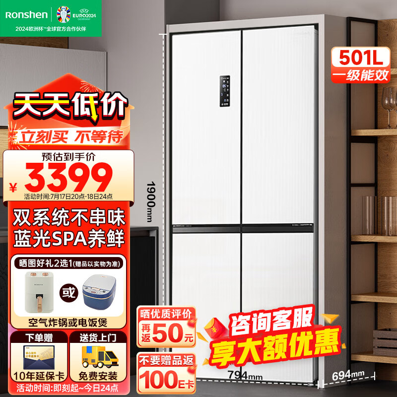 容声(Ronshen)蓝光养鲜501升十字对开四开门冰箱家用无霜变频一级能效BCD-501WD18FP大容量双循环白色价格:5099.00元!