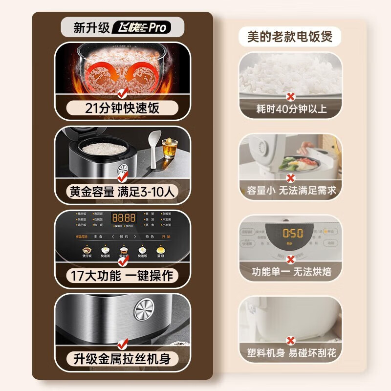 3、内胆容量:4L,有客人来也合适功能配置:17种功能,适用大部分场景操作难易:操作很便捷蒸饭口感:尝试了柴火饭,口感很好