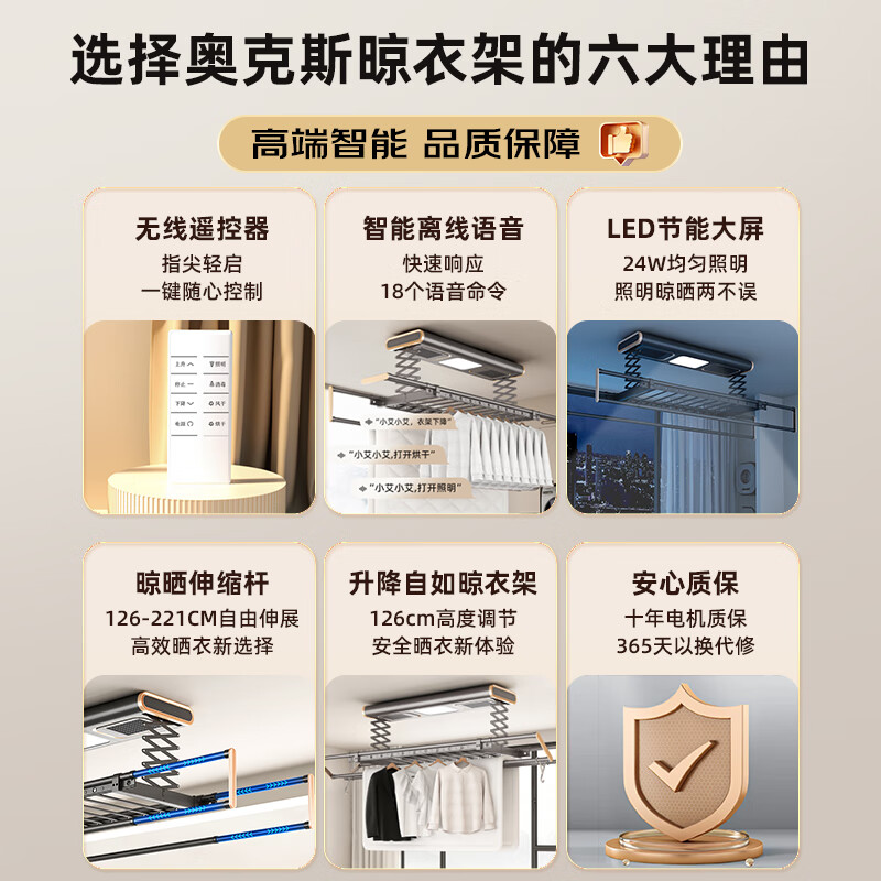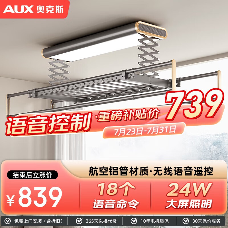 奥克斯(AUX)电动晾衣架升级款智能自动升降杆阳台室外无线语音遥控LED照明灰价格:839.00元!