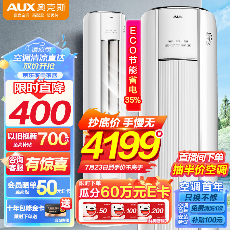 奥克斯(AUX)空调柜机3匹 新能效立式客厅 变频冷暖家用 ECO节能省电侠 KFR-72LW/BpR3GQS1(B3)大风量价格:4199.00元!