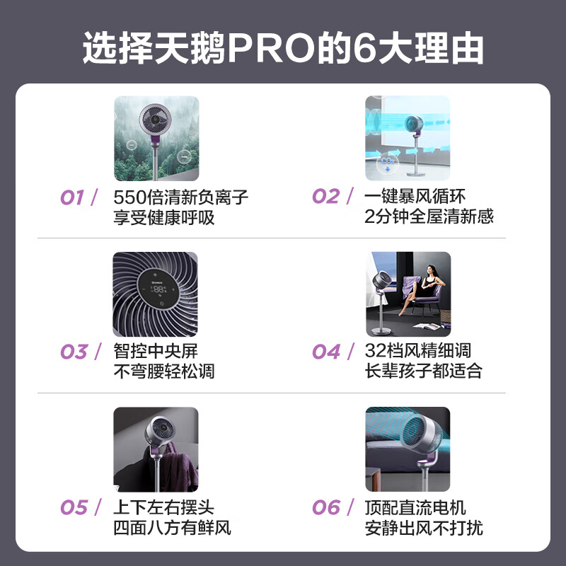 艾美特(AIRMATE)“紫天鹅升级款”空气循环扇负离子净化32档直流变频家用轻音落地扇3D自动摇头电风扇 RD70 PRO价格:659.00元!