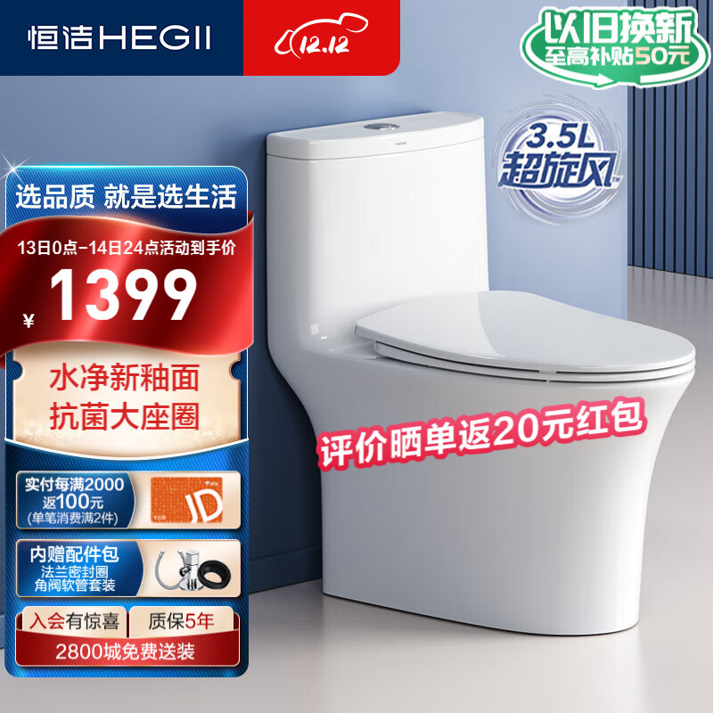 恒洁(HEGII)马桶562 超旋风大冲力虹吸式家用马桶坐便器HC0562DT-400价格:1599.00元!
