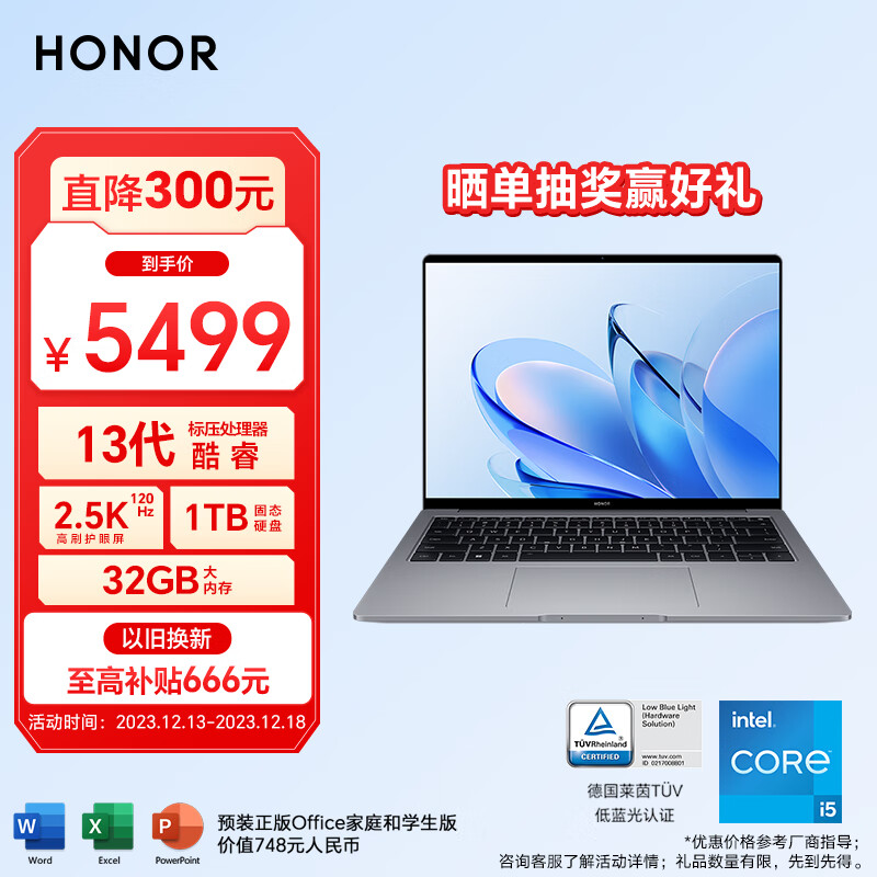 荣耀笔记本电脑MagicBook 14 2023 13代酷睿高性能轻薄本 标压i5-13500H 32G 1TB 2.5K高刷屏 智慧互联价格:5499.00元!
