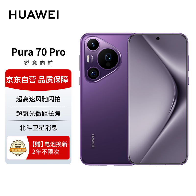 华为Pura70Pro 罗兰紫12GB+256GB 超高速风驰闪拍超聚光微距长焦 华为P70智能手机【2年电池换新套装】价格:6499.00元!
