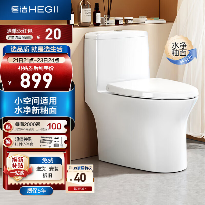 恒洁(HEGII)马桶171 家用节水防臭水净釉面虹吸式坐便器HC0171PT0E-400价格:1389.00元!
