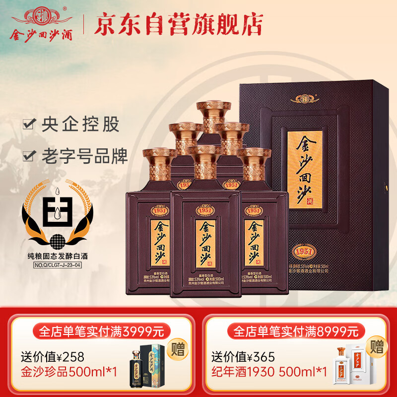 金沙回沙酒 纪年酒1951 酱香型白酒 53度 500ml*6瓶 整箱装 纯粮食酒价格:2430.00元!