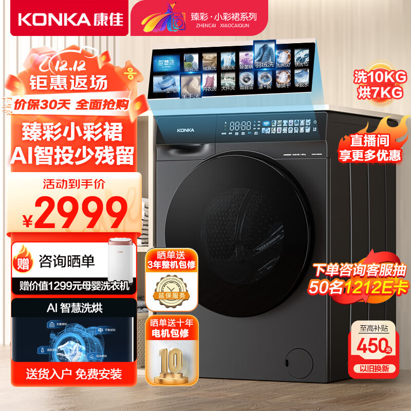 康佳(KONKA)滚筒洗衣机全自动 臻彩系列小彩裙 10KG洗烘一体 巴氏除菌 智能投放 1.08洗净比 KH100-X1408AQIT价格:2999.00元!