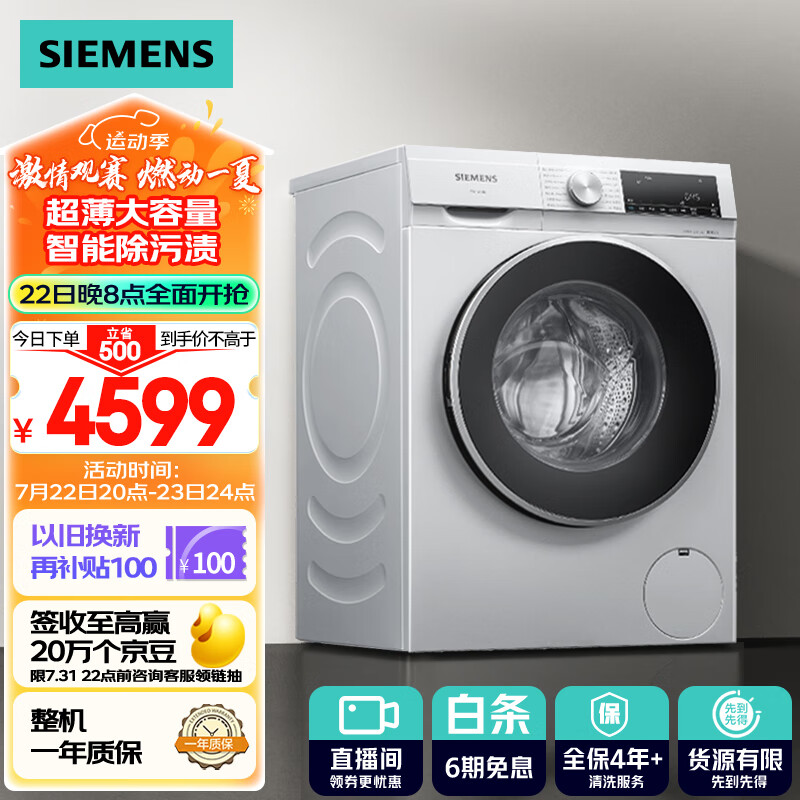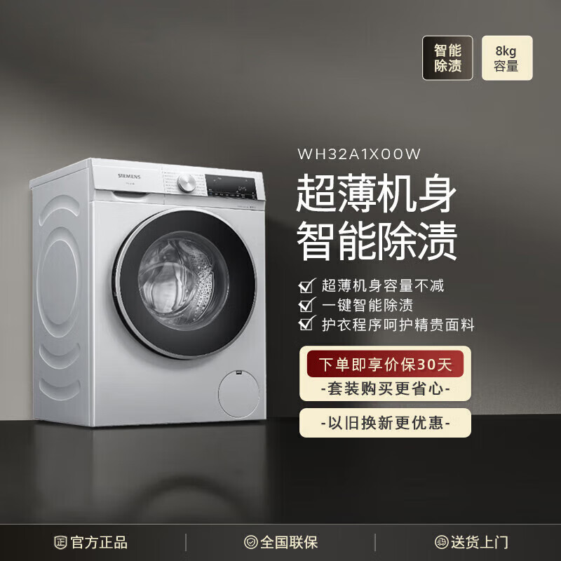 西门子(SIEMENS) 8公斤超薄滚筒小洗衣机全自动 496mm超薄机身 智能除污渍 专业羽绒洗XQG80-WH32A1X00W价格:4599.00元!