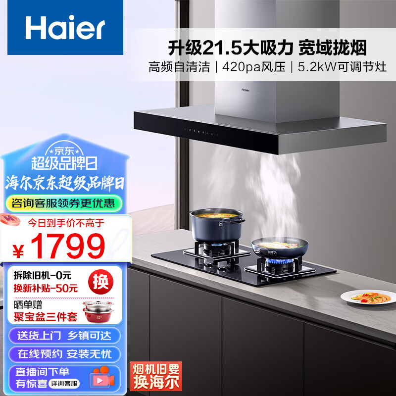 海尔(Haier)抽油烟机 顶吸欧式烟灶套装 升级21.5m3/min大吸力 挥手智控自清洁 油烟机灶具套装T11+Q2BE3(天)价格:1899.00元!