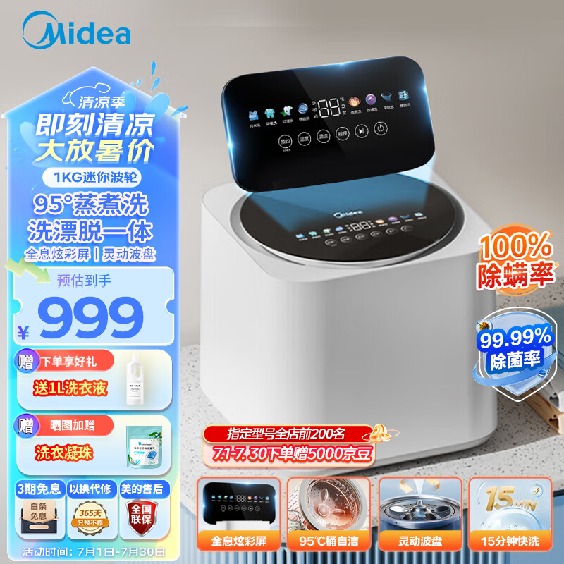 美的(Midea)1KG迷你波轮内衣洗衣机全自动 小型内衣裤洗衣机 婴儿洗衣机95℃高温杀菌 健康除螨洗MNB10-03WE价格:999.00元!