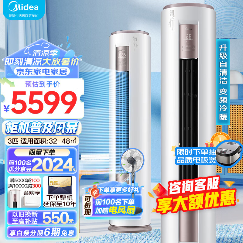 美的(Midea)3匹 智行 新一级能效 变频冷暖 立式空调柜机 智能家电 KFR-72LW/BDN8Y-YH200(1)A价格:5599.00元!