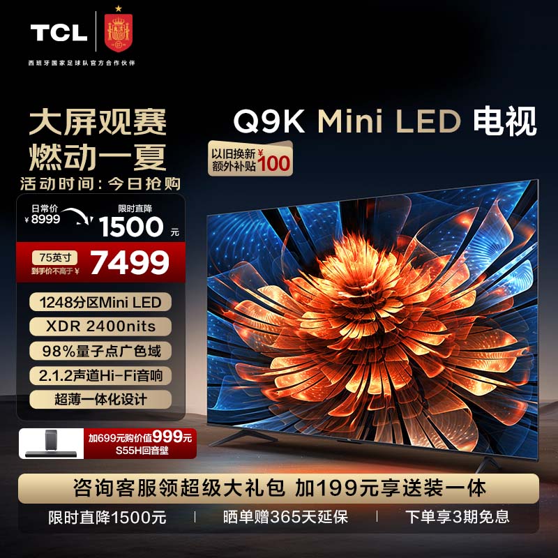 TCL电视 75Q9K 75英寸 Mini LED 1248分区 XDR 2400nits QLED量子点 超薄 4K大屏 液晶智能平板电视机价格:7499.00元!