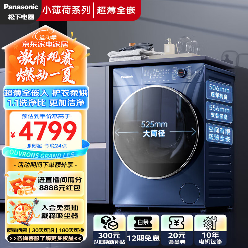 松下(Panasonic)滚筒洗衣机全自动506超薄全嵌【小薄荷SD】10公斤洗烘一体水氧泡沫净 户外服洗天幕蓝XQG100-SD151价格:4799.00元!