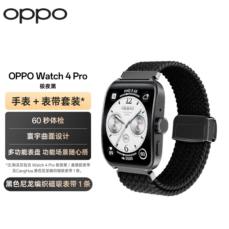 OPPO Watch 4 Pro 极夜黑 全智能手表 男女运动手表 智能健康eSIM电话手表+黑色尼龙编织表带套装价格:2342.00元!