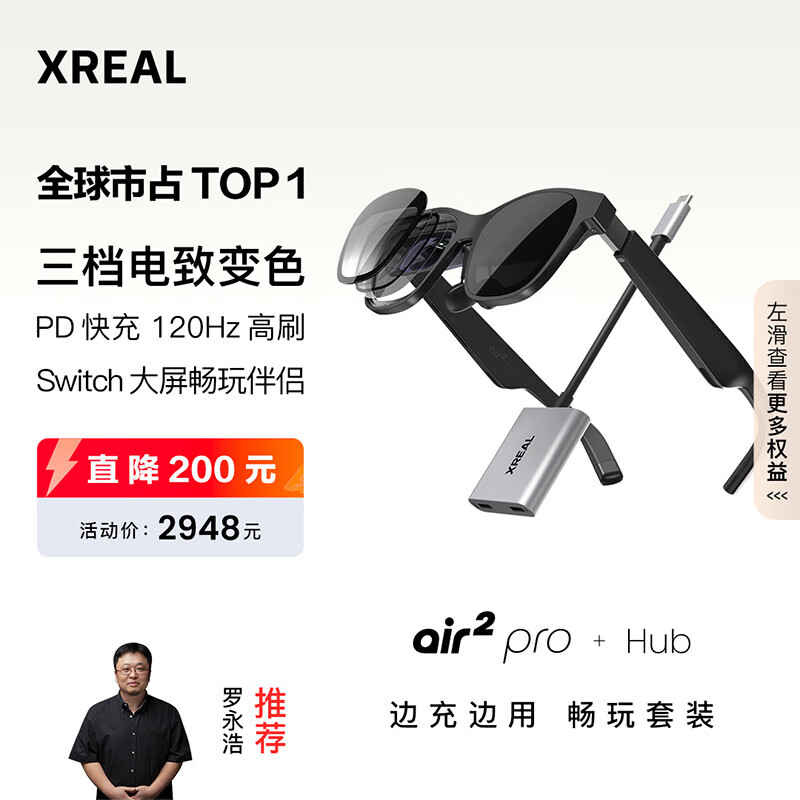 XREAL Air 2 Pro智能AR眼镜 电致变色调节 Hub边充边用套装 Switch必备 掌机直连 PD快充 非VR眼镜价格:3498.00元!
