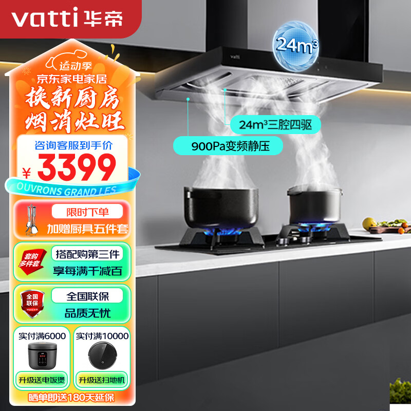 华帝(VATTI)抽油烟机家用顶侧欧式变频大吸力烟机燃气灶烟灶套装24风量自动清洗吸油烟机灶具套装i11206天然气价格:3399.00元!