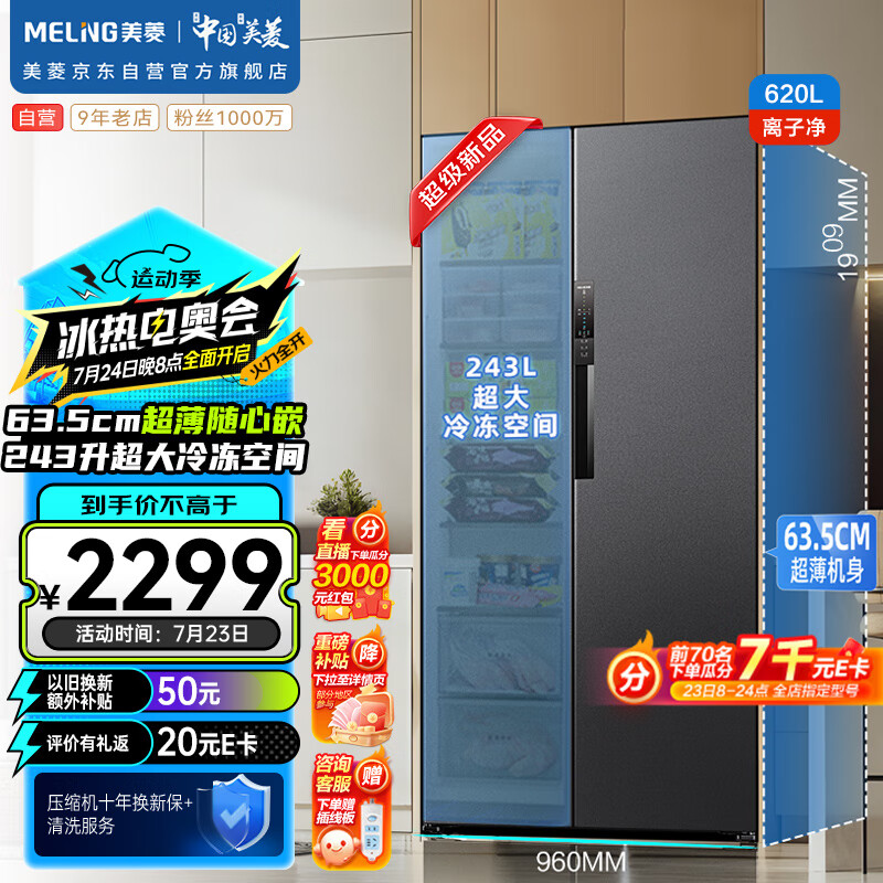 美菱(MeiLing)620升双变频一级能效节能对开门双开门家用冰箱风冷无霜抗菌净味大冷冻BCD-620WPCX超大容量价格:2399.00元!
