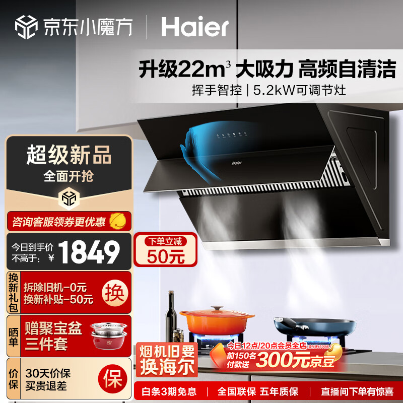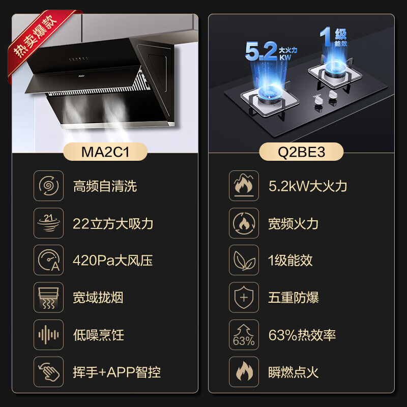 海尔(Haier)抽油烟机 油烟机燃气灶侧吸式烟灶套装 升级22风量大吸力 挥手智控自清洁 5.2kw天然气灶MA2C1+BE3价格:1899.00元!