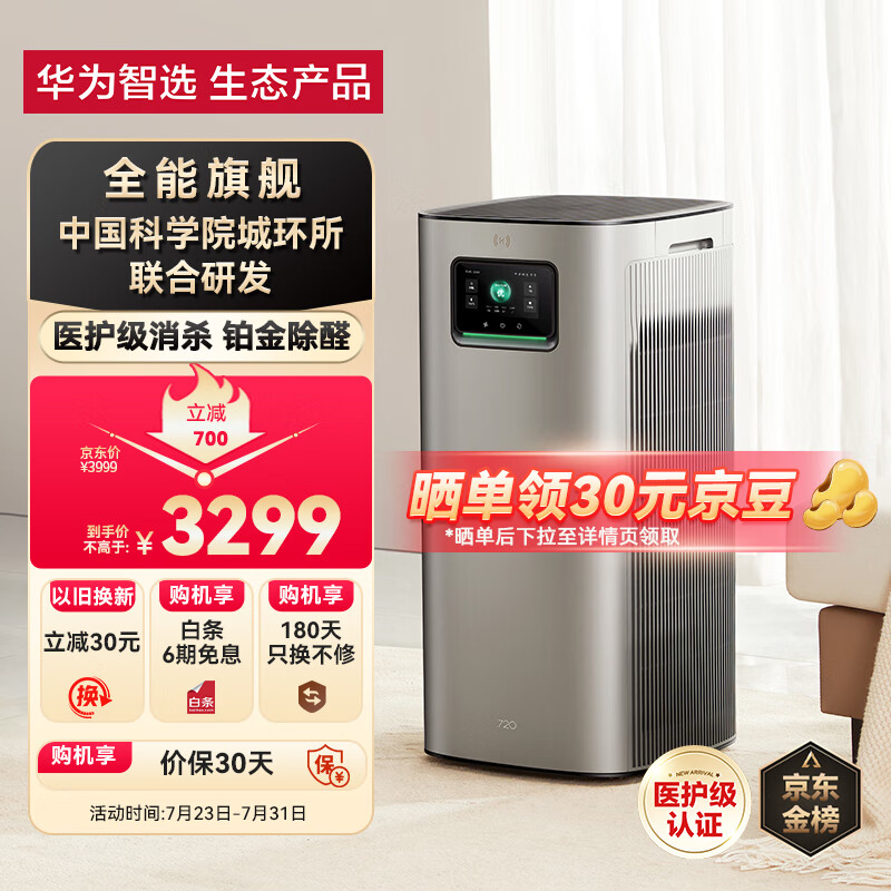 华为智选720智能空气净化器3Pro 铂金除醛 大空间疾速净化 除甲醛异味过敏原吸猫毛 主动消杀 鸿蒙智联价格:3999.00元!