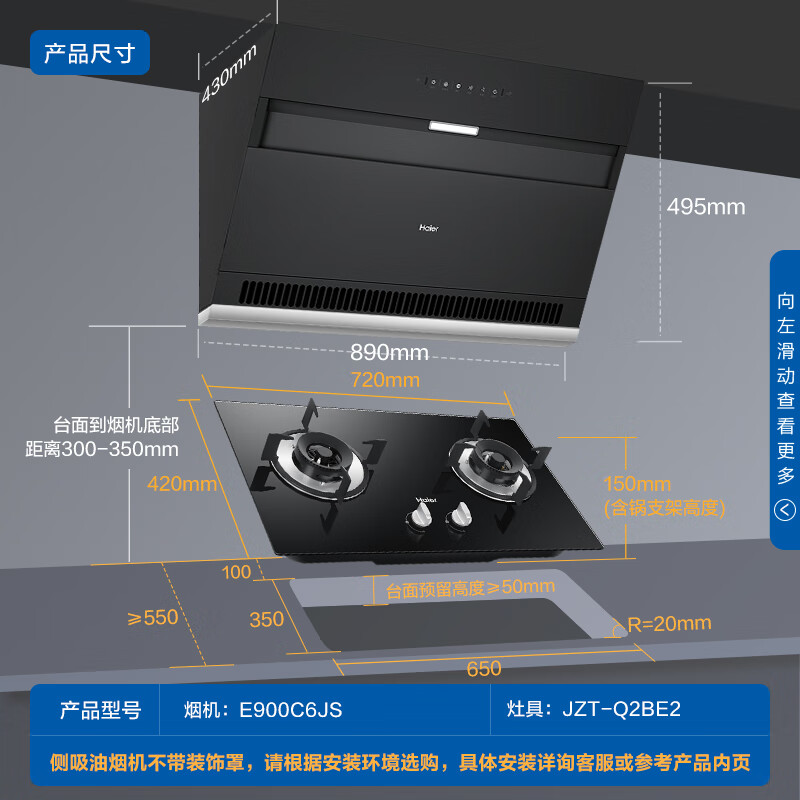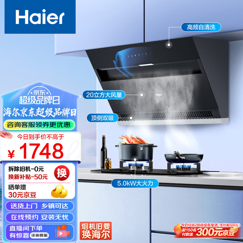 海尔(Haier)抽油烟机 顶侧双吸厨房烟灶套装 20m3/min大吸力 家用侧吸式油烟机灶具套装C6JS+Q2BE2天价格:1748.00元!